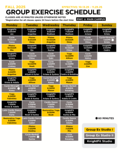You are now registered! All classes are 30-55 minutes in length unless otherwise noted. Please bring a towel and water bottle. If you make a reservation and decide you cannot make it for your workout, please cancel your reservation to open up a spot for another Knight. Cancellations must be made at least 1 hour prior to class.